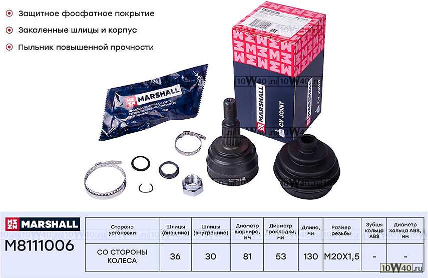 | MARSHALL | M8111006 | | ШРУС ВНЕШ. (БЕЗ ABS) AUDI A3 (8L, 8P) 96- SKODA OCTAVIA I (A4), II (A5) 96- VW GOLF IV 97- (M8111006) |