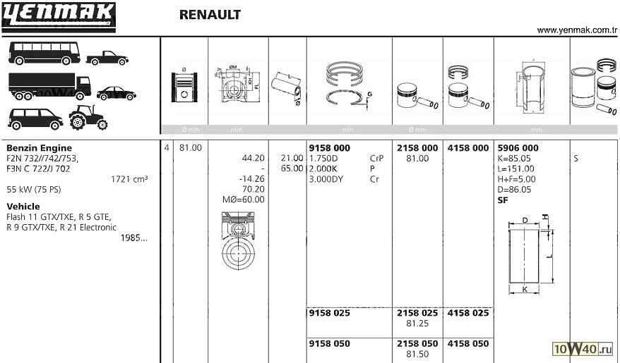 | YENMAK | 31-04158-050 | | Поршень ДВС с кольцами Renault R19 1.7 F2/3N =81 1.75x2x3 +0.50 88> |