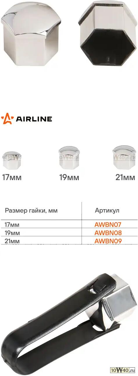 | AIRLINE | AWBN09 | | Колпачки на колесные болты/гайки 21 мм, хром, пластик, 20 шт.+ съёмник (AWBN09) |