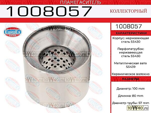 | EUROEX | 1008057 | | пламегаситель коллекторный 100x80x57 нерж. (диаметр трубы 57мм, общая длина 80мм диаметр бочонка 100 |